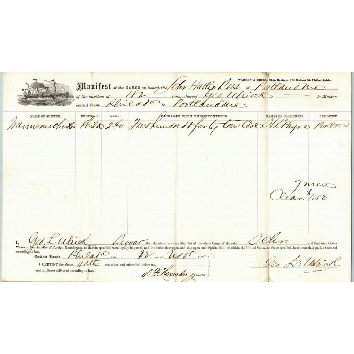 1871 Merchant Ship Cargo Manifest Document Schooner Hattie Ross to Portland Ore