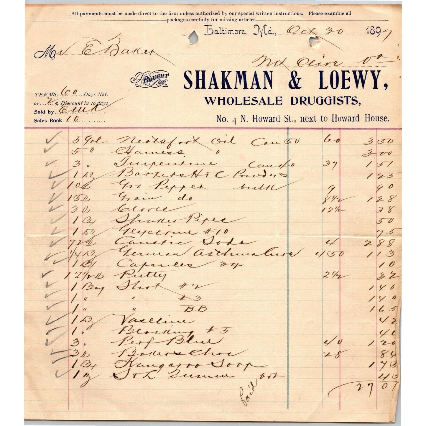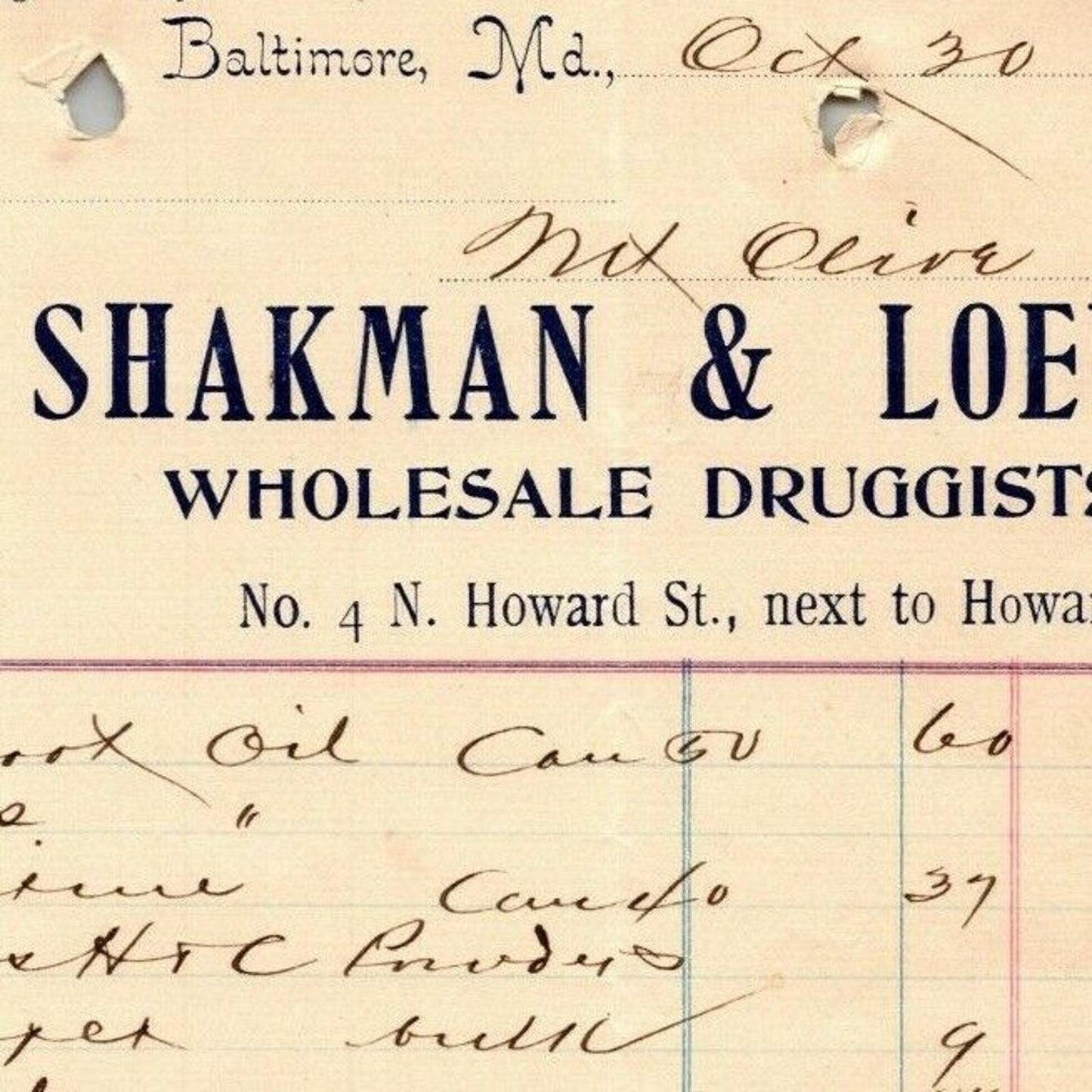 1899 Letterhead Billhead Shakman & Loewy Druggists Baltimore - Ephraim Baker*