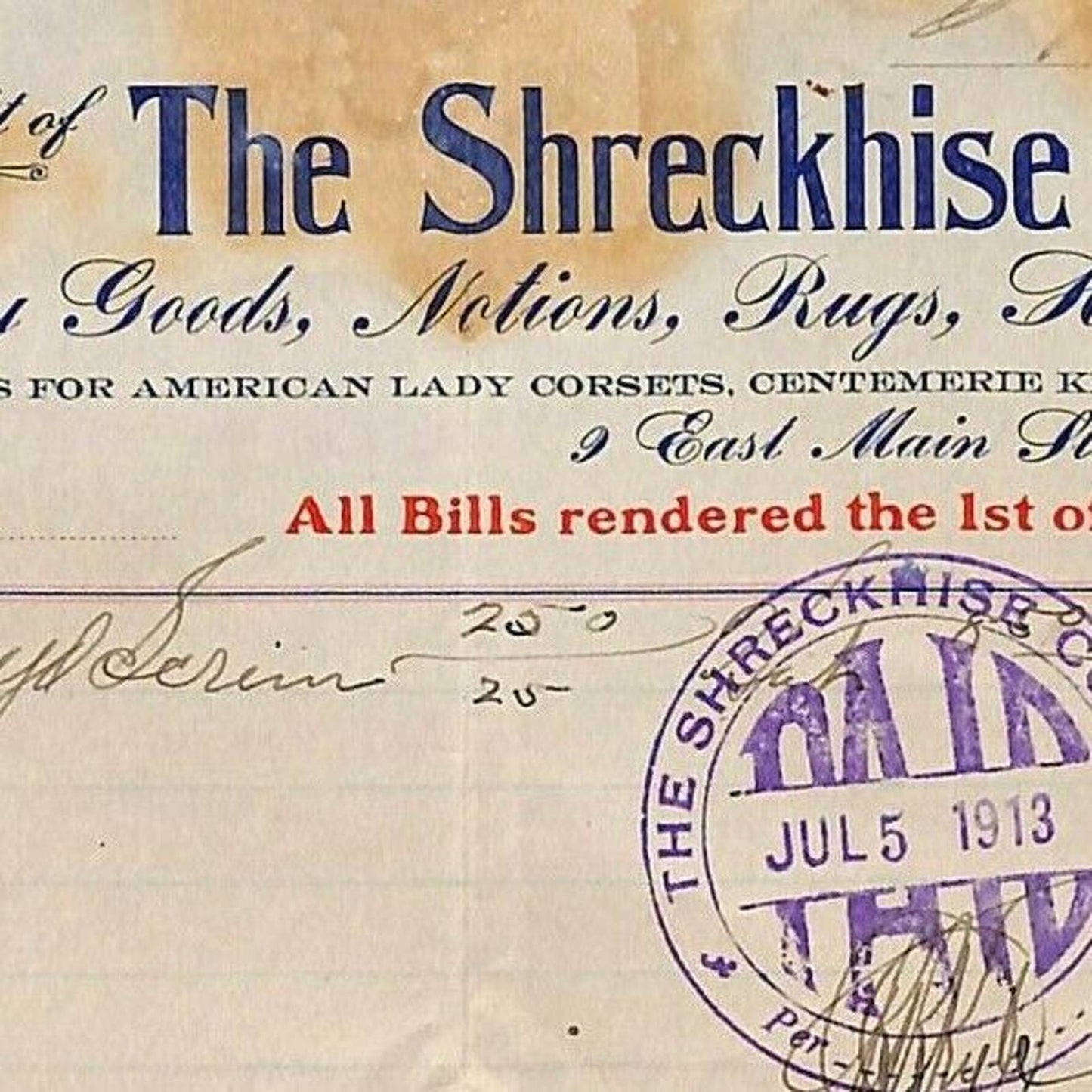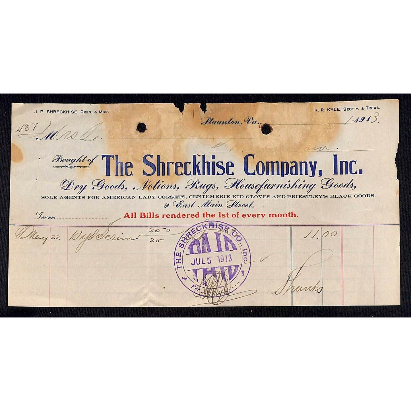 1913 Scarce Shreckhise Company Dry Goods Rugs Letterhead Billhead Staunton, VA