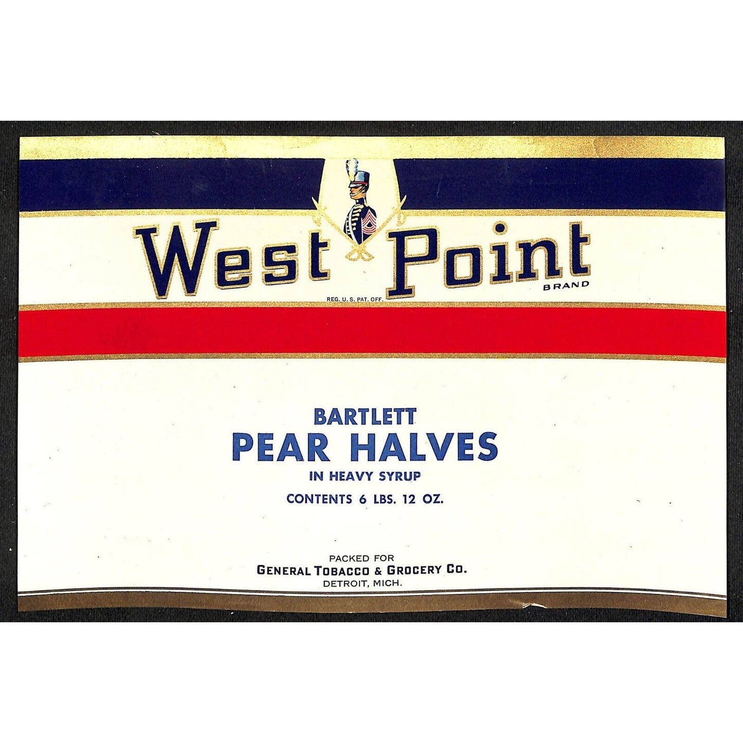 1941 Paper Can Label West Point Brand Bartlett Pear Halves w/ Cadet Very Scarce