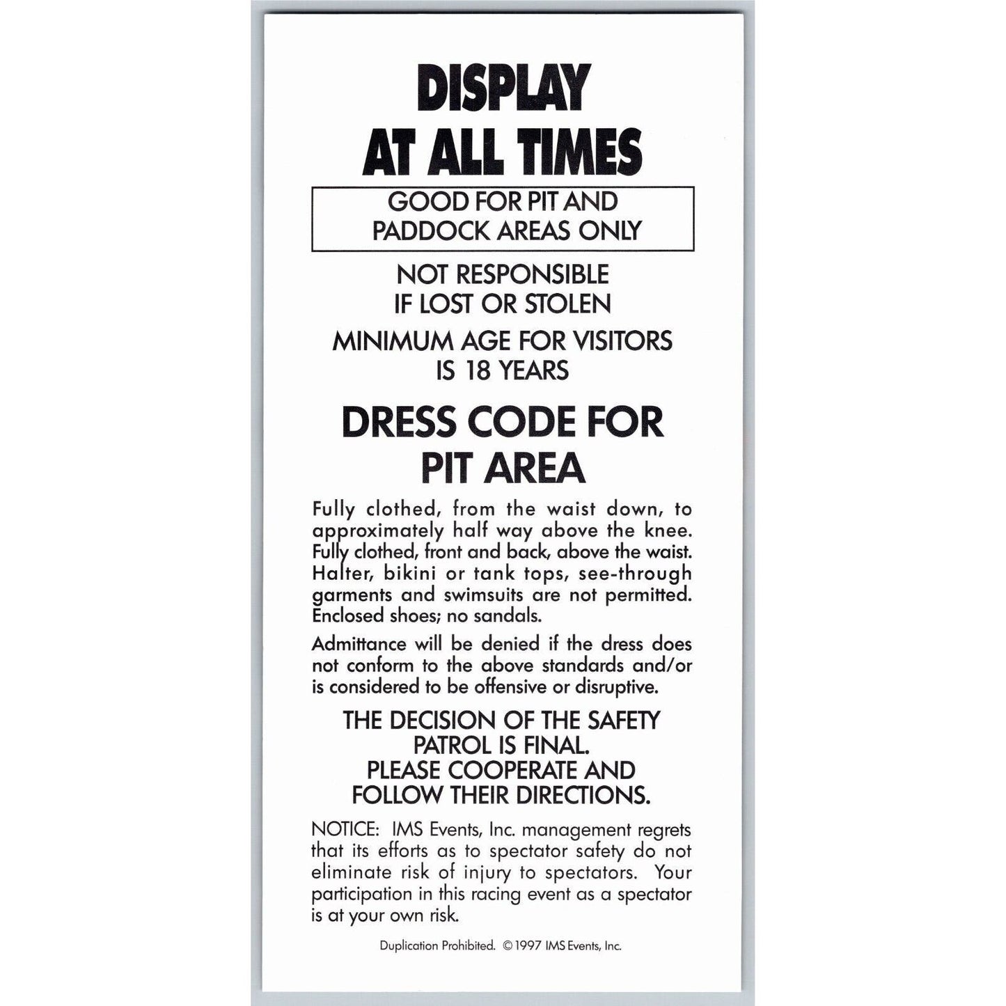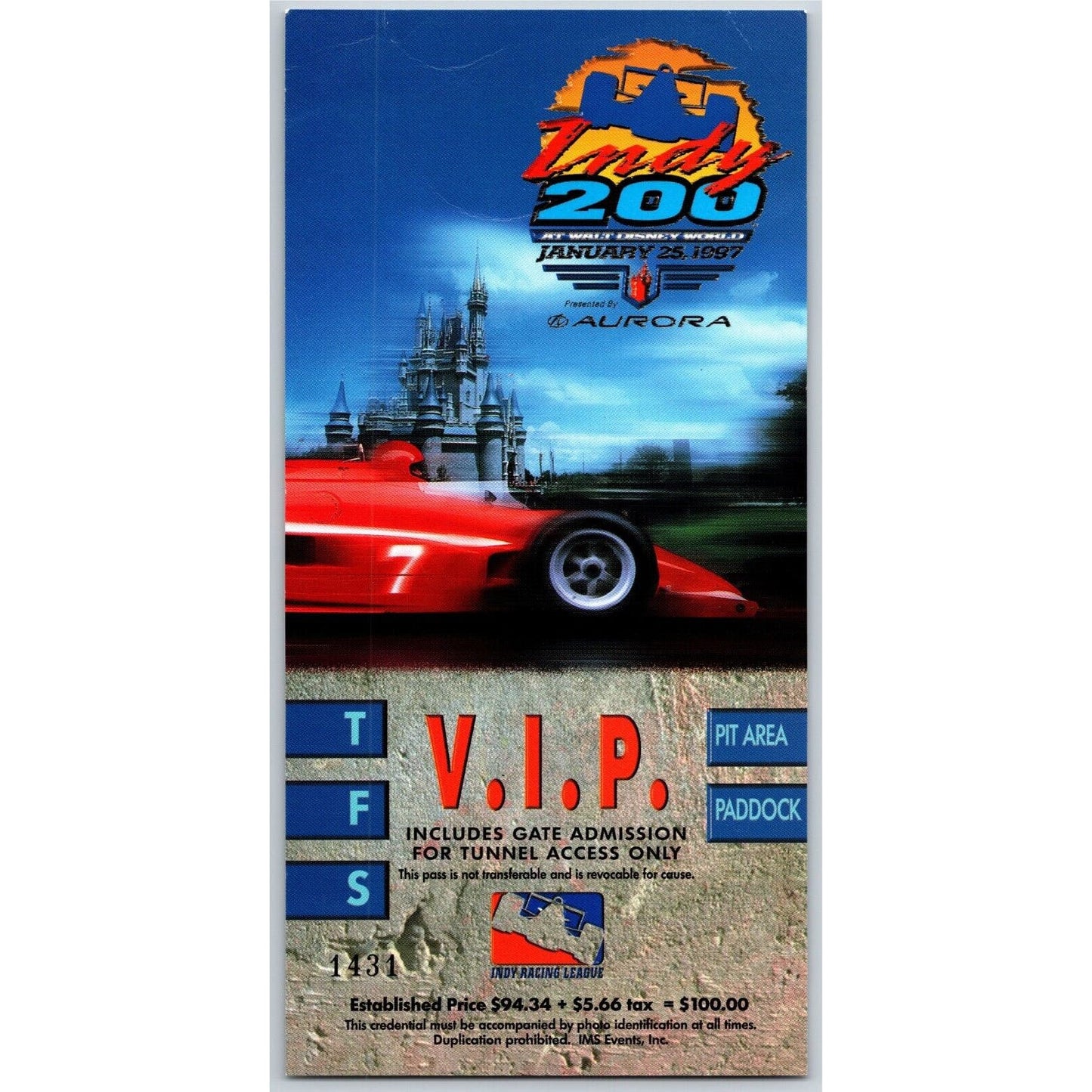 1997 Walt Disney World Speedway Indy 200 VIP / Pit Pass #1431