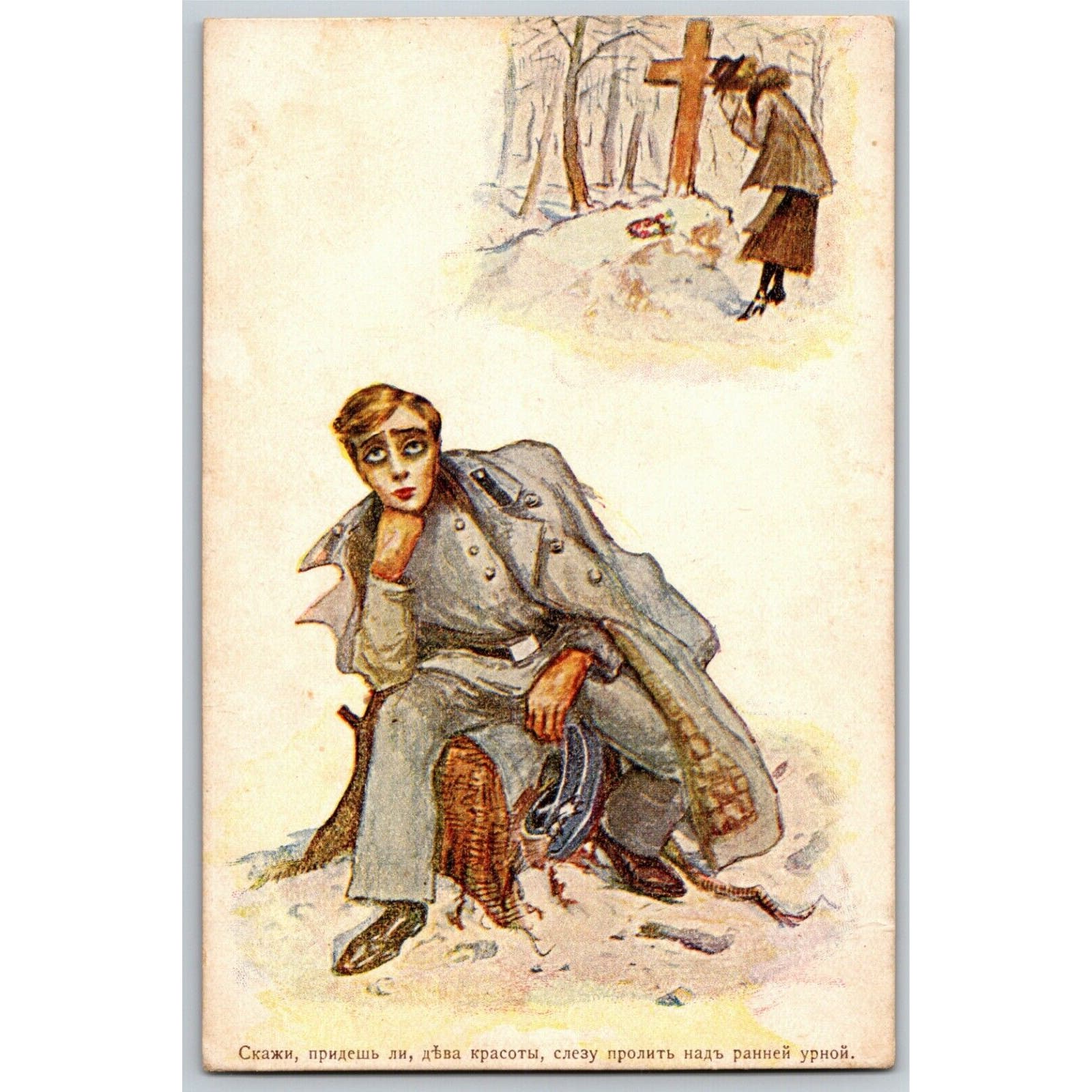 c1914-18 Russian Military Art Postcard - Will You Shed a Tear Over an Early Urn?