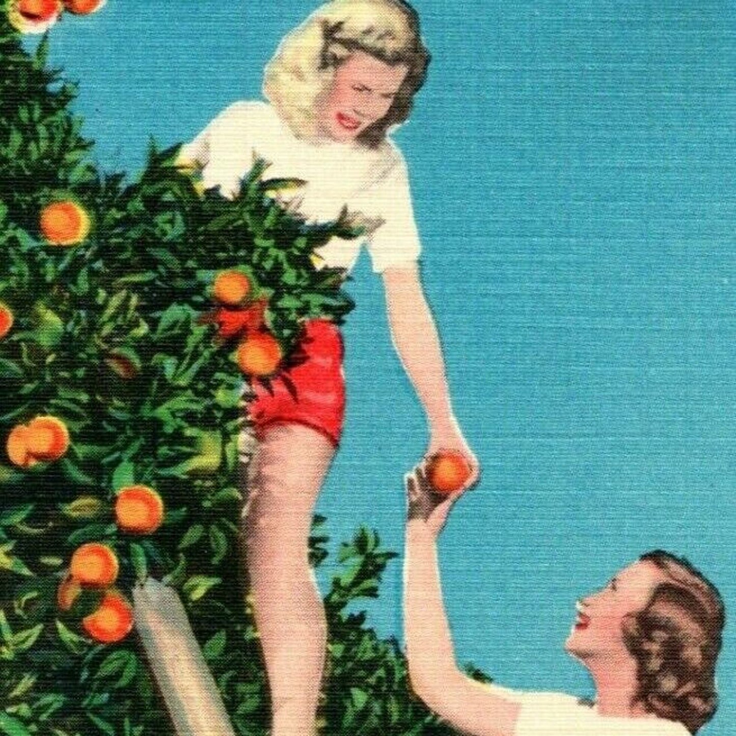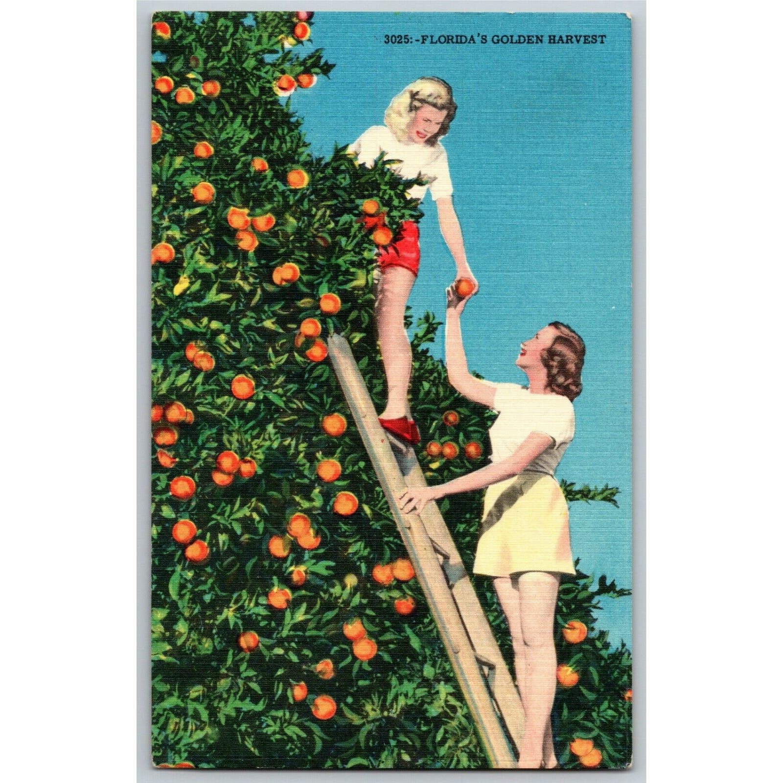 c1940's Vintage Linen Fruit Postcard Florida Women on Ladder Picking Oranges VGC