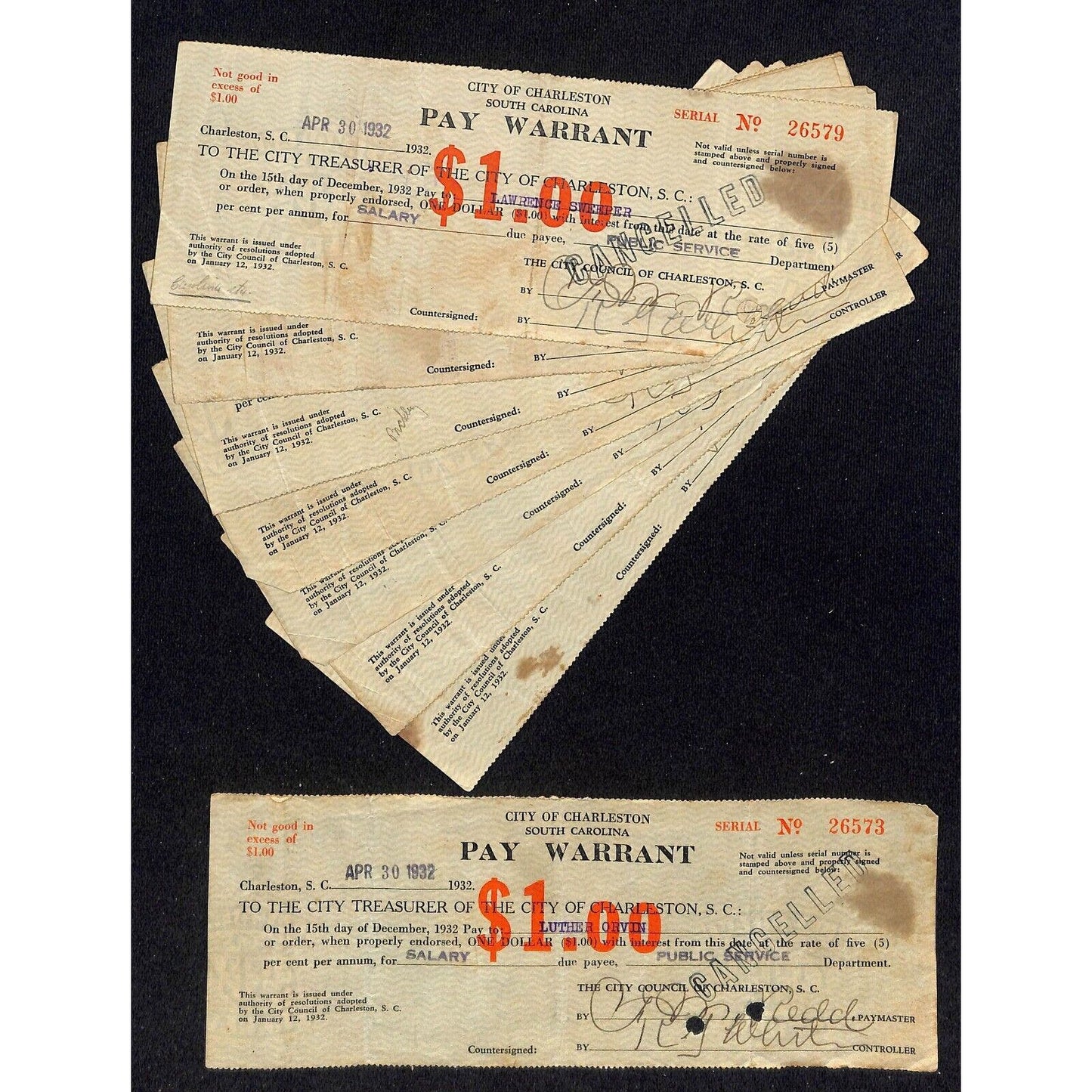 City of Charleston, SC Pay Group of 10 1932 Warrant / Check / Script (6 are cut)