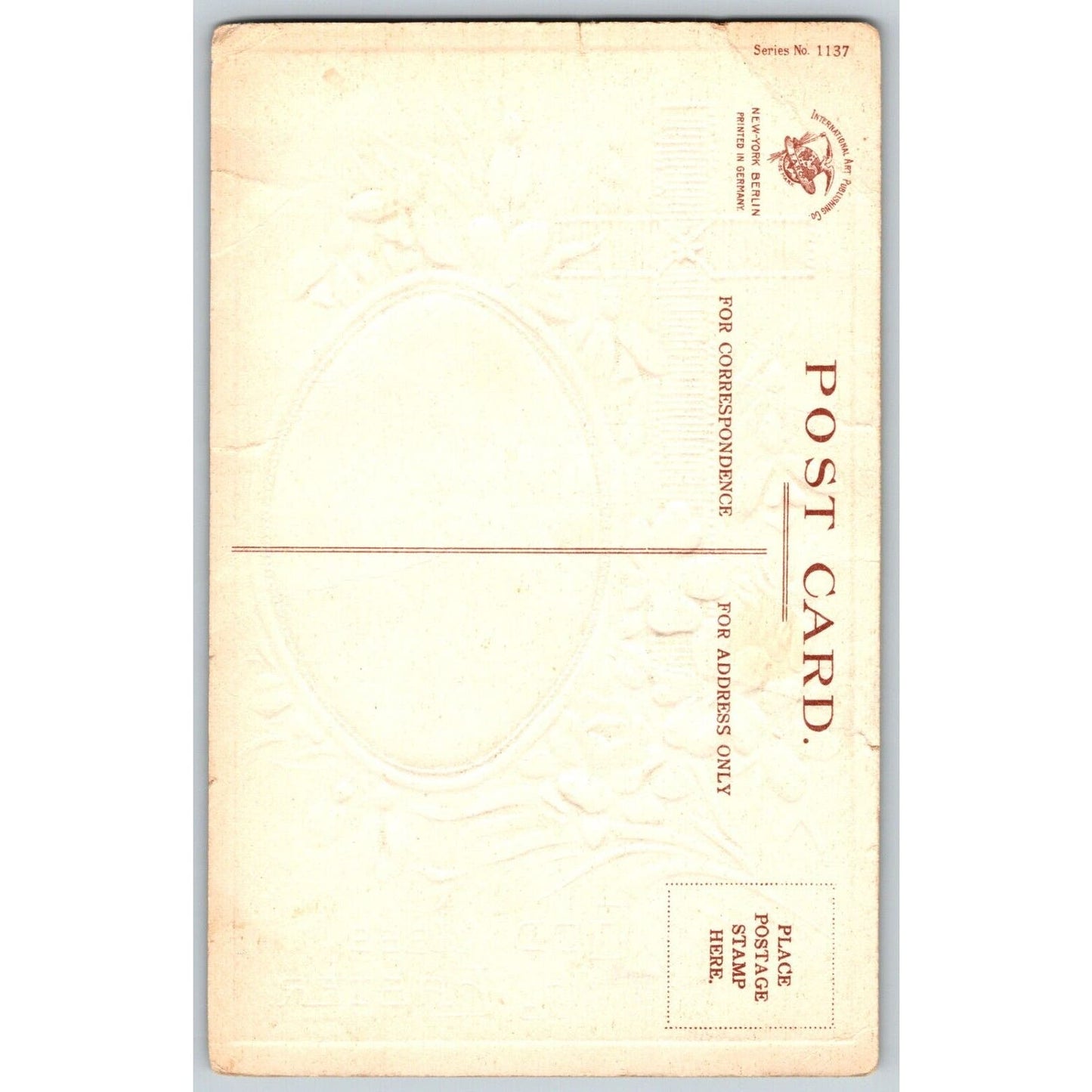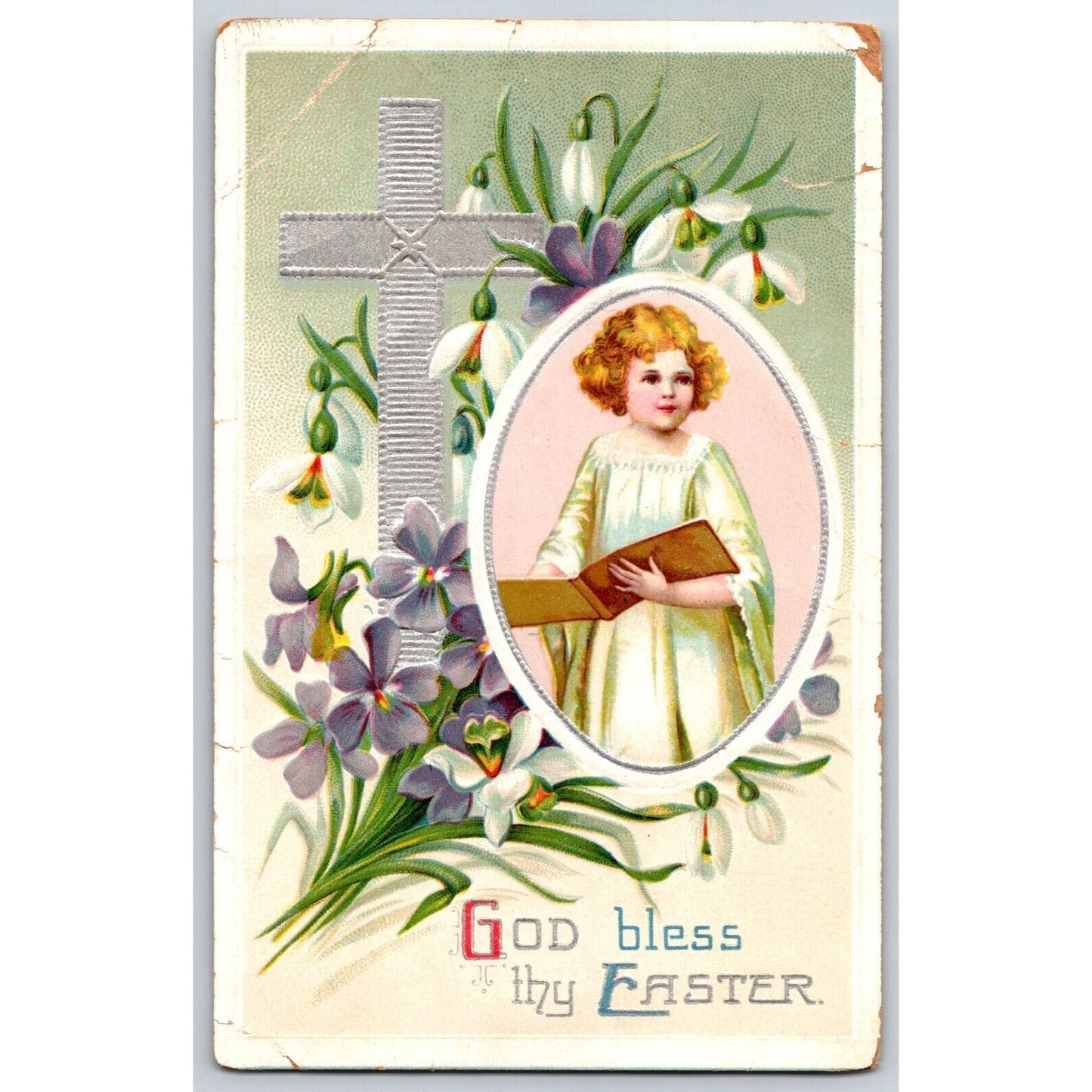 Easter Postcard "God Bless thy Easter" Floral Silver Cross Girl Emb. NP c1915