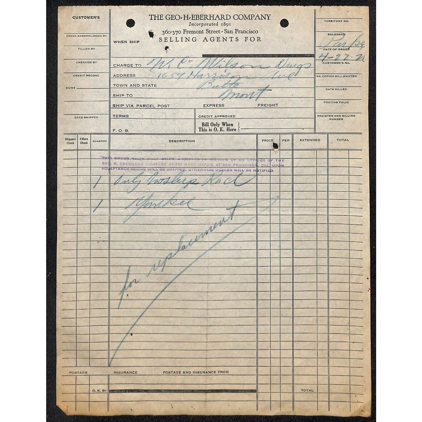This billhead is part of a collection of paper I recently acquired related to the goods and services purchased for the operation of "Wilson Drug" or "W.C. Wilson, Druggist" located at 1659 Harrison Ave, Butte, Montana