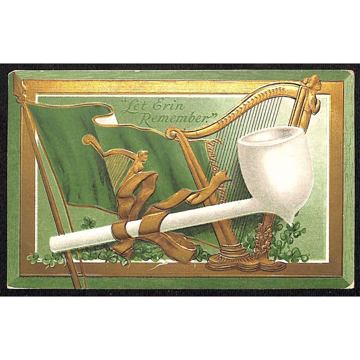 Ireland Postcard Let Erin Remember w/ Harp Pipe Flag Gilt Embossed c1909-15