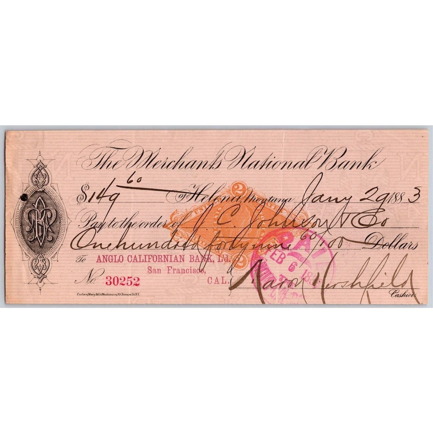 Merchants National Bank Helena, MT 1883 w/ Revenue Stamp Underprint VGC