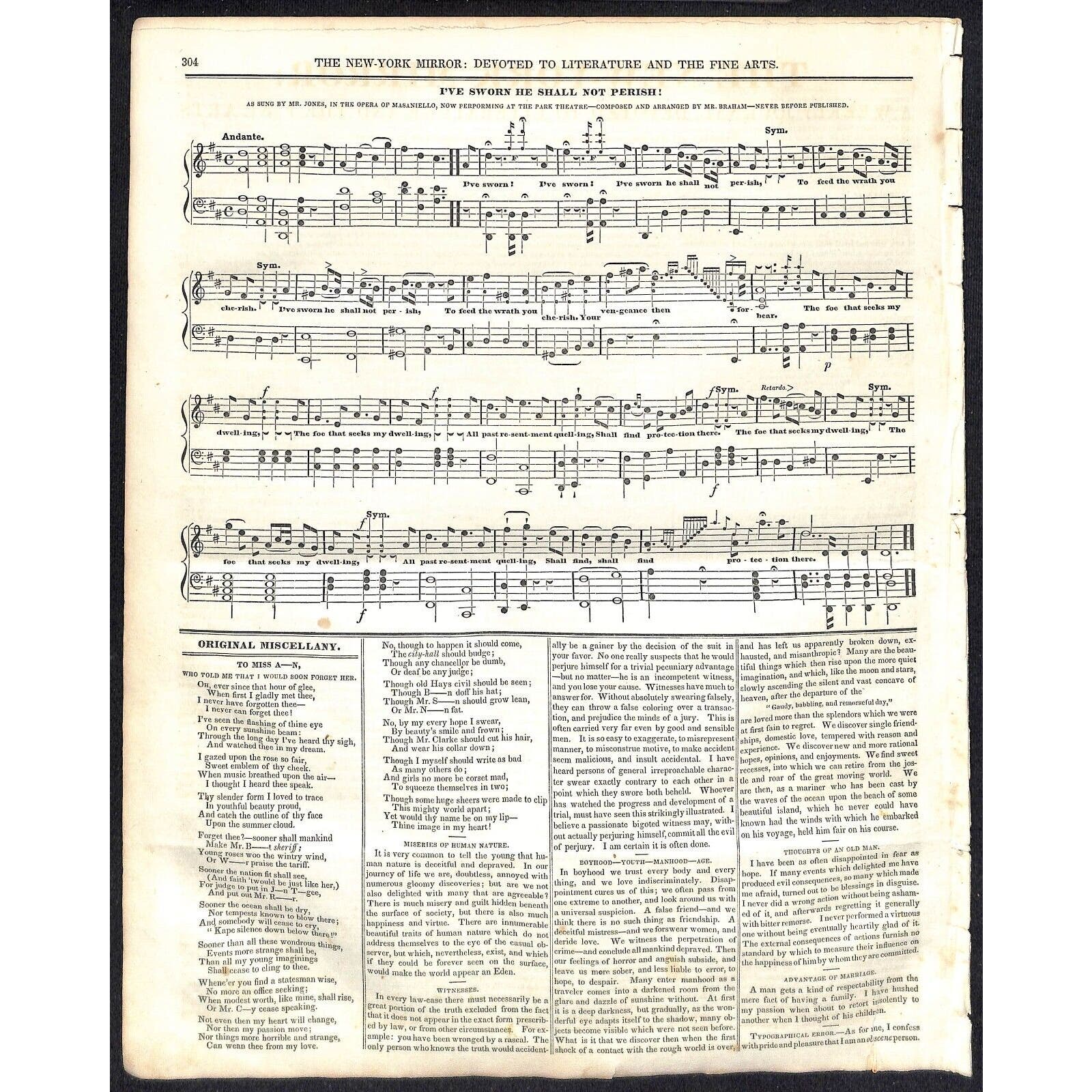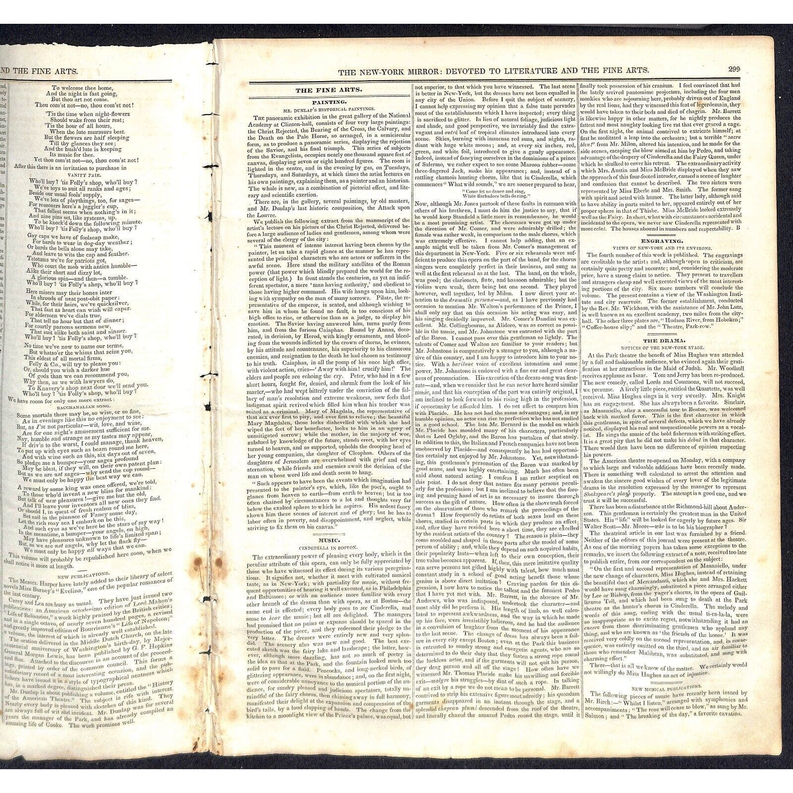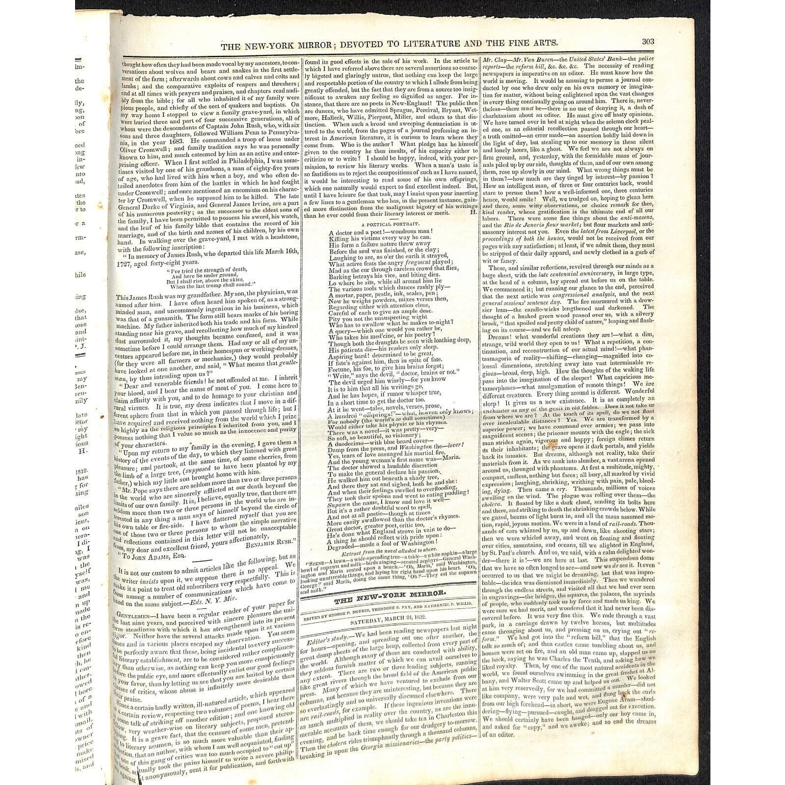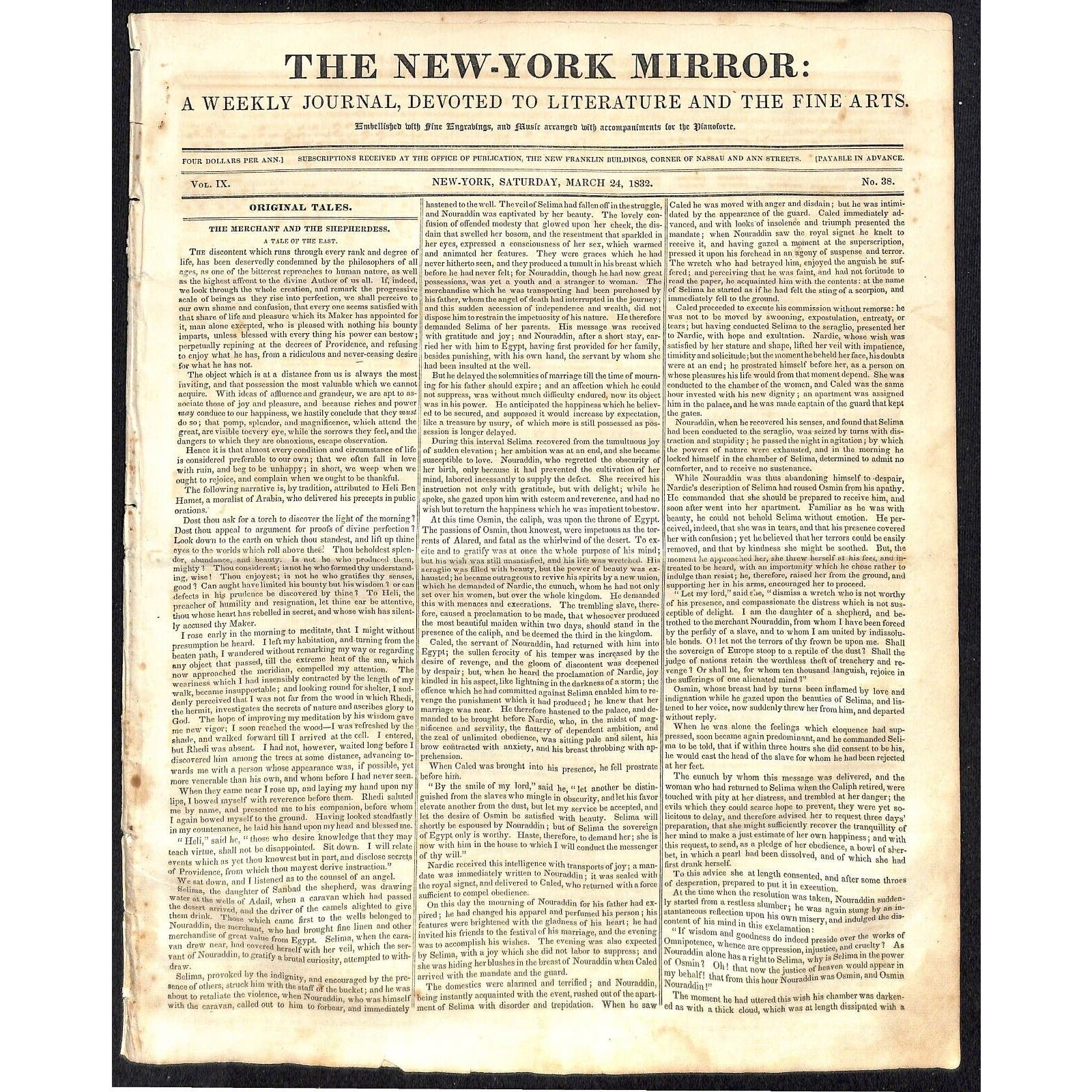 The Mirror was founded by George Pope Morris and Samuel Woodworth in August 1823. The journal was a weekly publication, and it included coverage of arts and literature in addition to local news. Circulation flagged in the 1840s and at the end of 1842 the paper was closed. In 1843 Morris partnered with popular writer Nathaniel Parker Willis to revamp the business, and together they relaunched the newspaper as The New Mirror, which published weekly for eighteen months. They then established The Evening Mirror in 1844. - Source - Wikipedia.