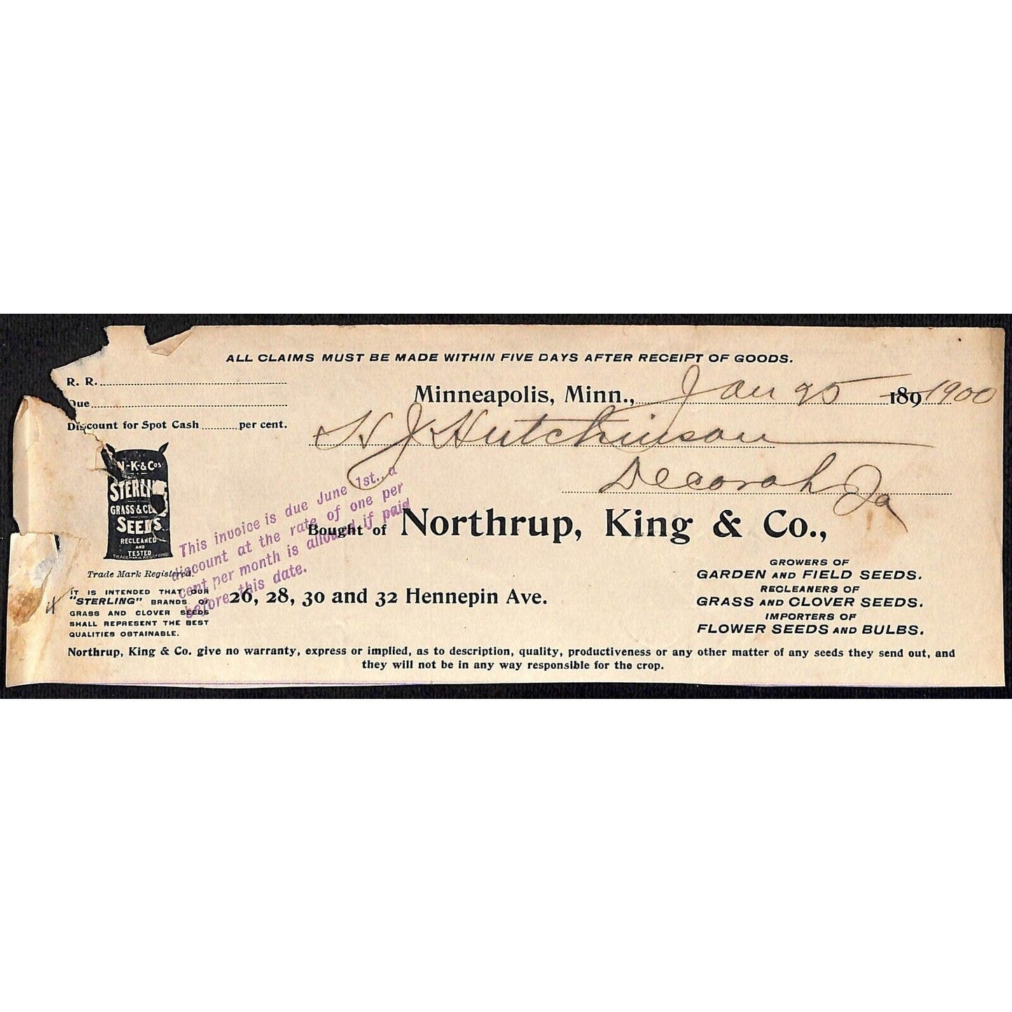 Northrup, King & Co Seeds Minn. HJ Hutchinson Decorah, IA* Cut 1900 Billhead