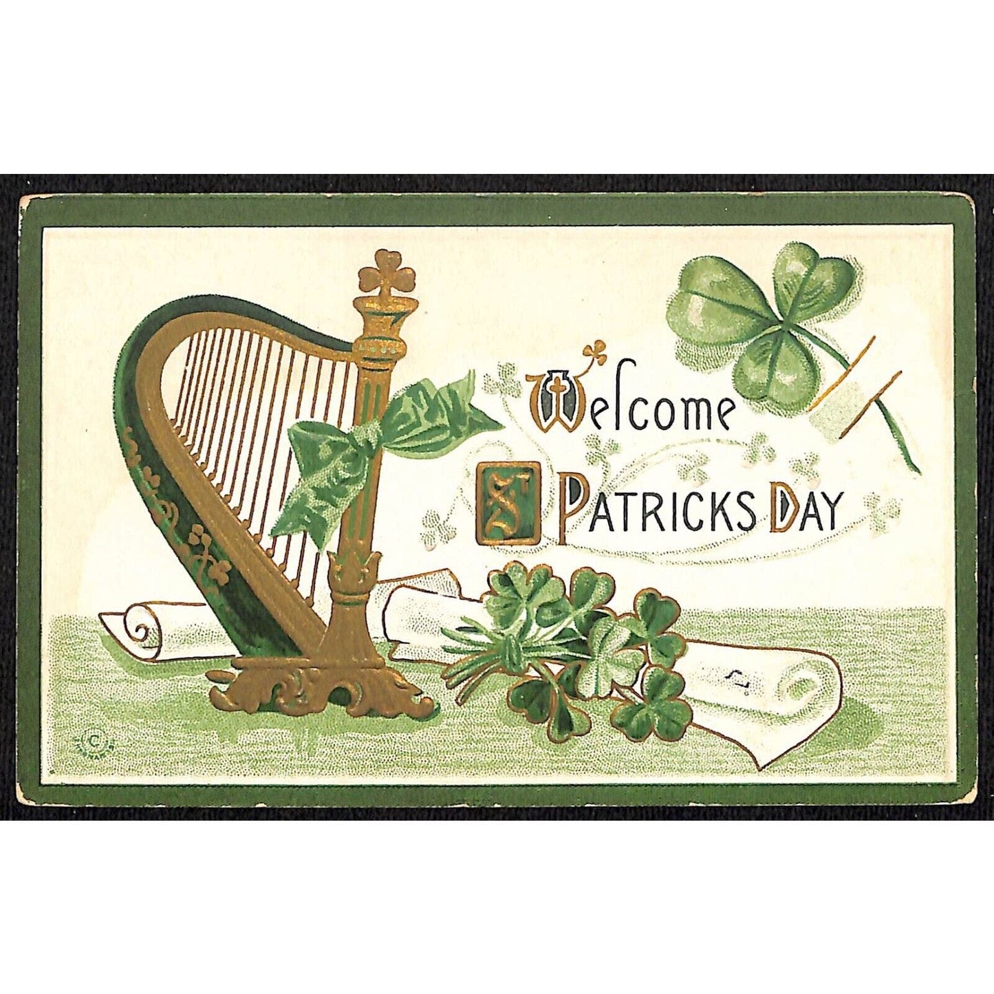 St. Patrick's Day Postcard Harp Clovers Gilt Embossed - NP c1913