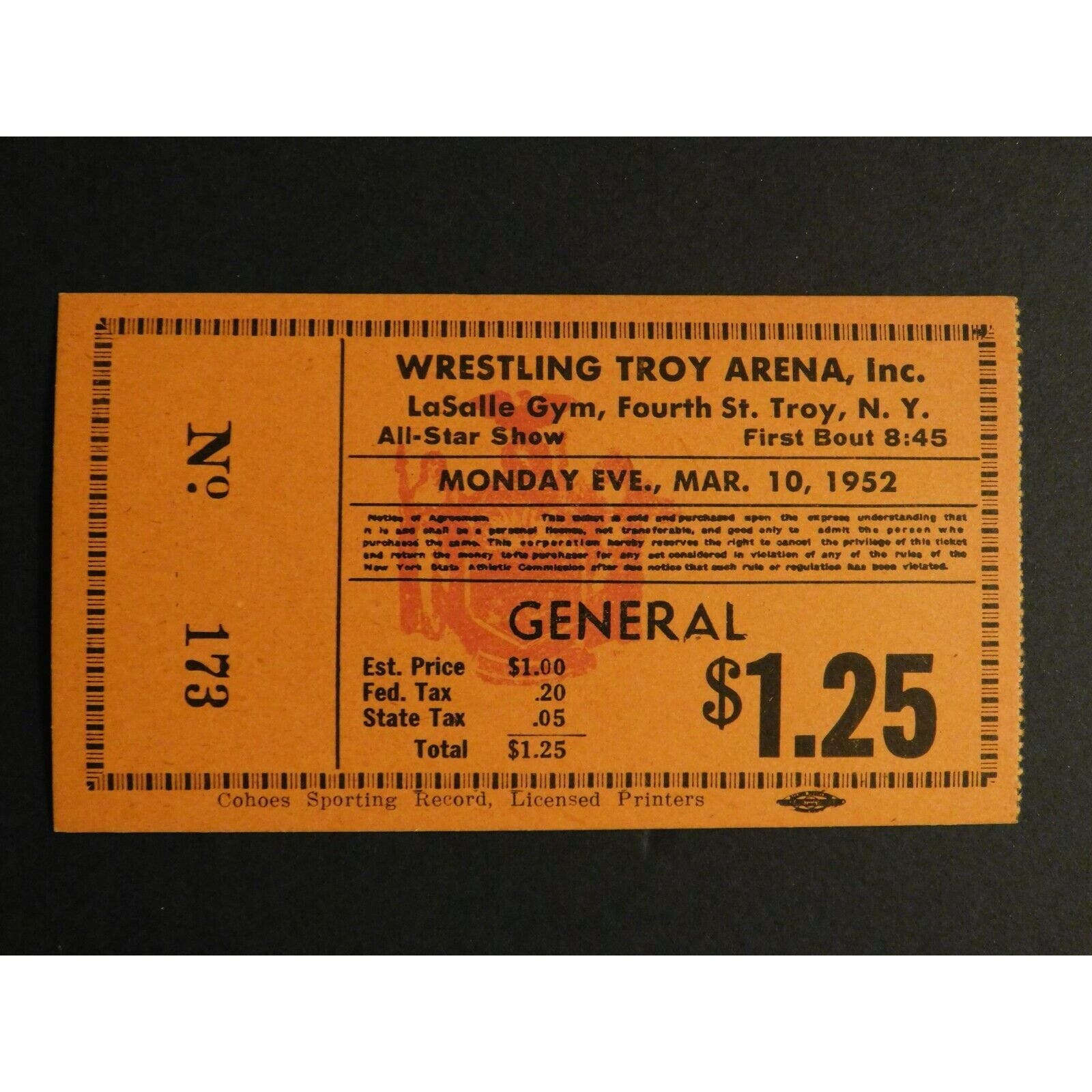 Vintage Mint Mar 10 1952 Troy, NY Arena Wrestling Ticket - Unused / NOS
