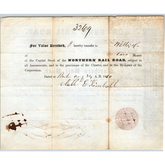 1847 Boston, MA Northern Railroad Stock Certificate No. 767 for Two Shares